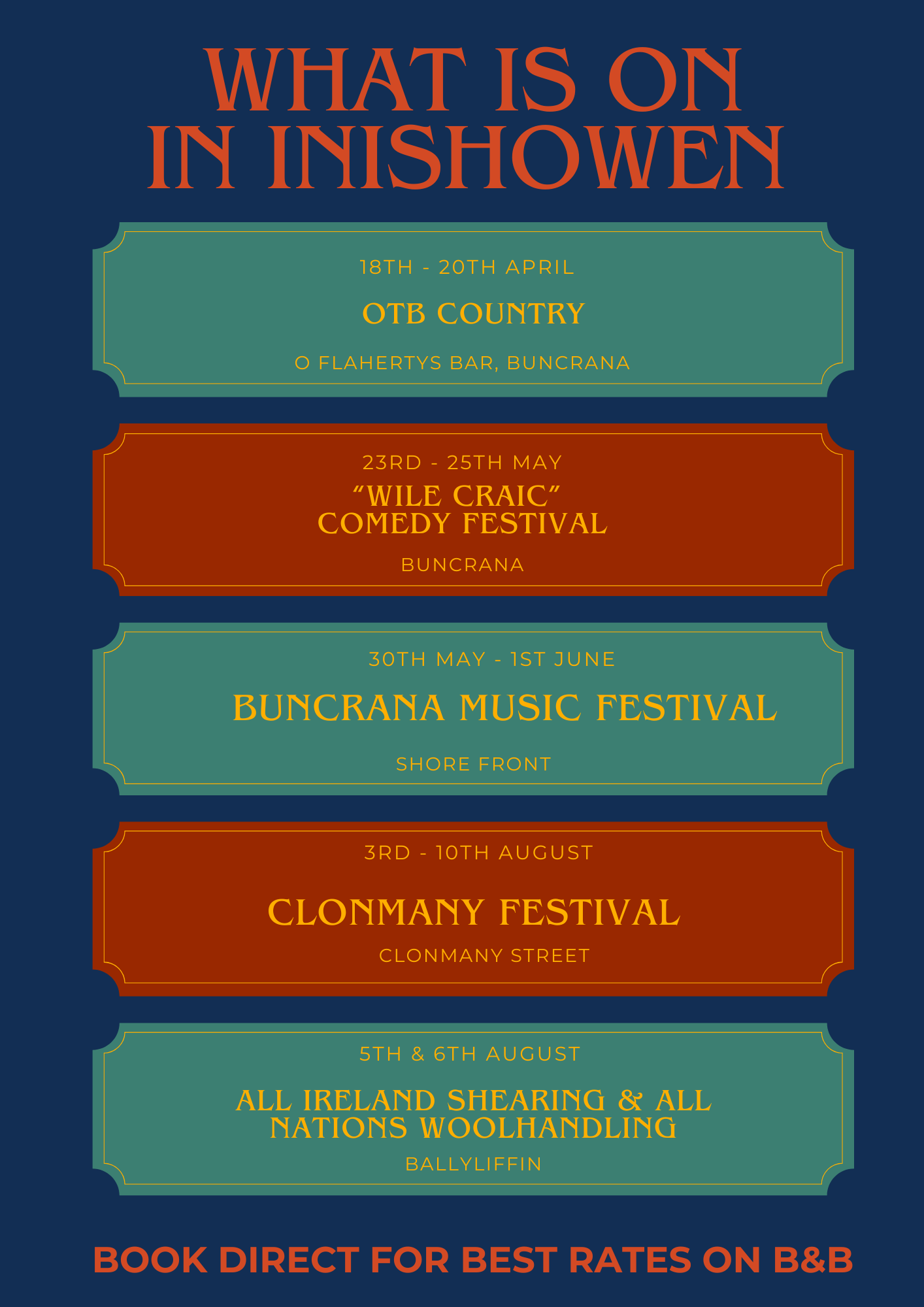 There is lots of exciting upcoming events happening around Inishowen. Book directly with ourselves for best rates on B&B.